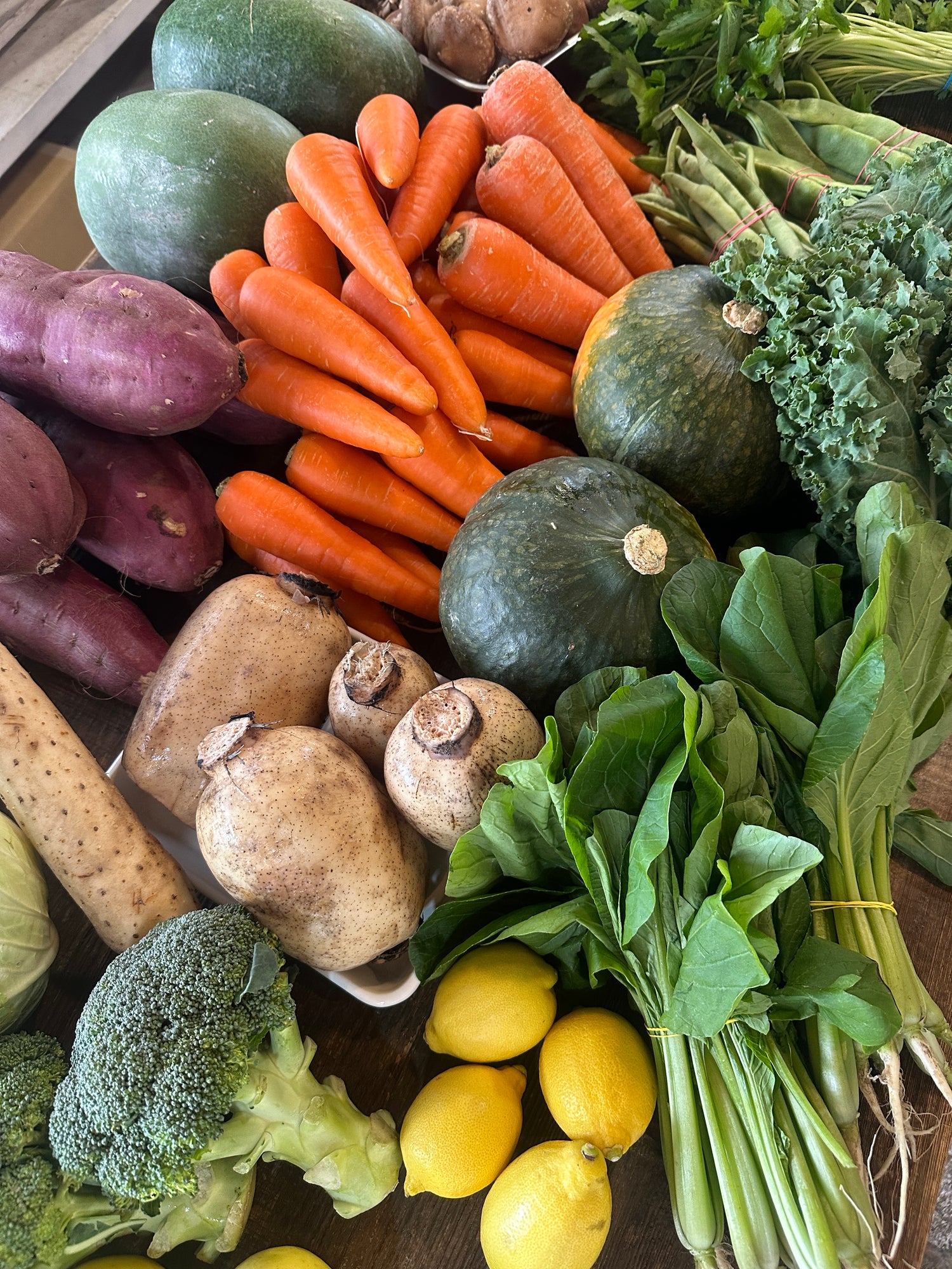 有機トマト缶、かぼちゃ、大根、キャベツ、冬瓜、人参、ブロッコリー、小松菜、モロッコいんげん、ゴーヤ、りんご、舞茸、椎茸、菊の花、パクチー(生)
