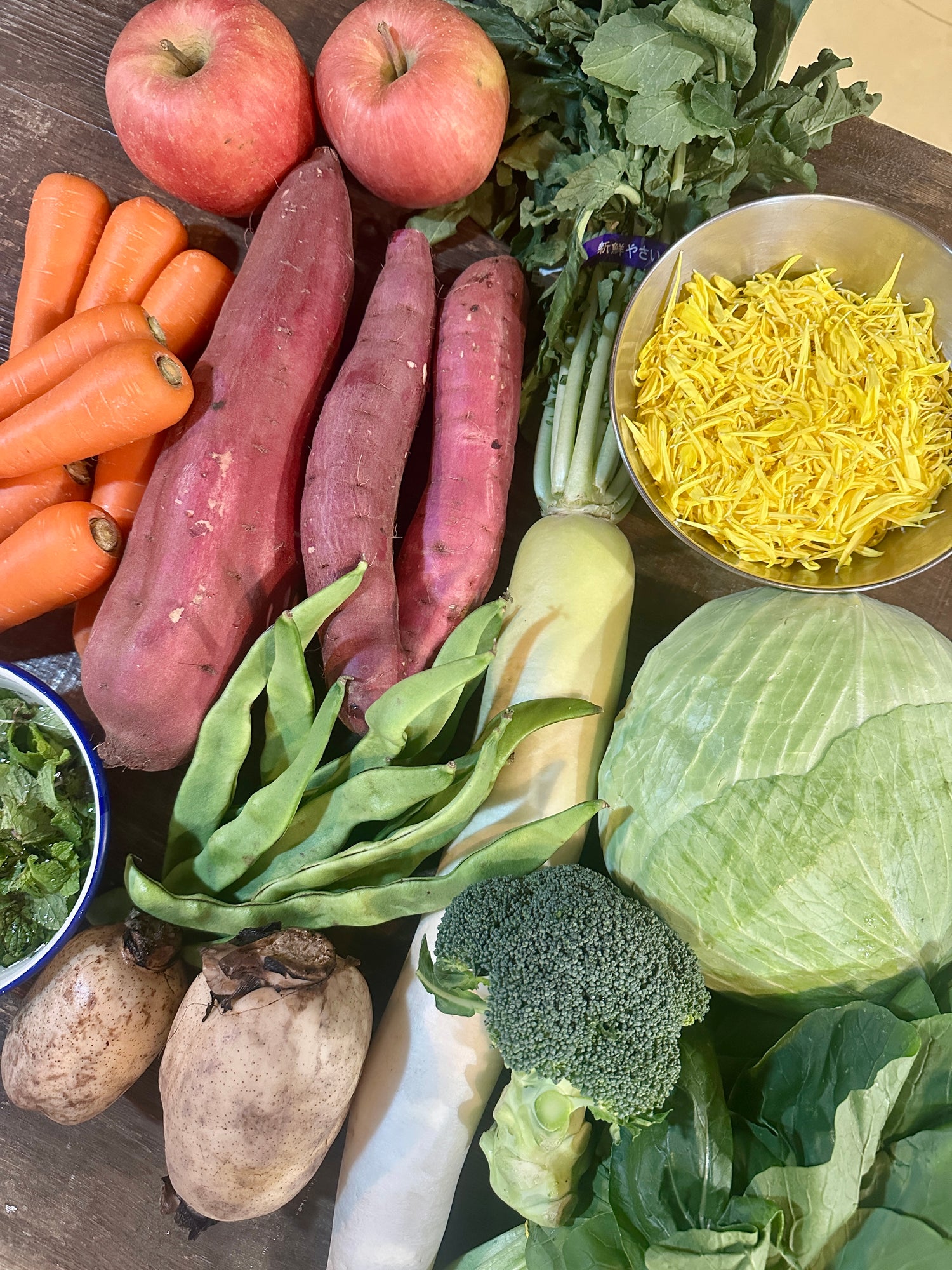 大根、冬瓜、れんこん、さつまいも、キャベツ、人参、山芋、インゲン、ゴーヤ、りんご、えのき、菊の花、三つ葉(生)