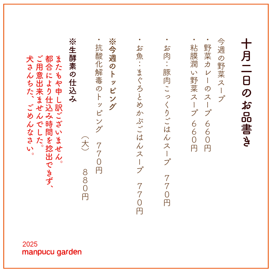 食材も毎週木曜日に仕入れますので、毎週食材は異なります。