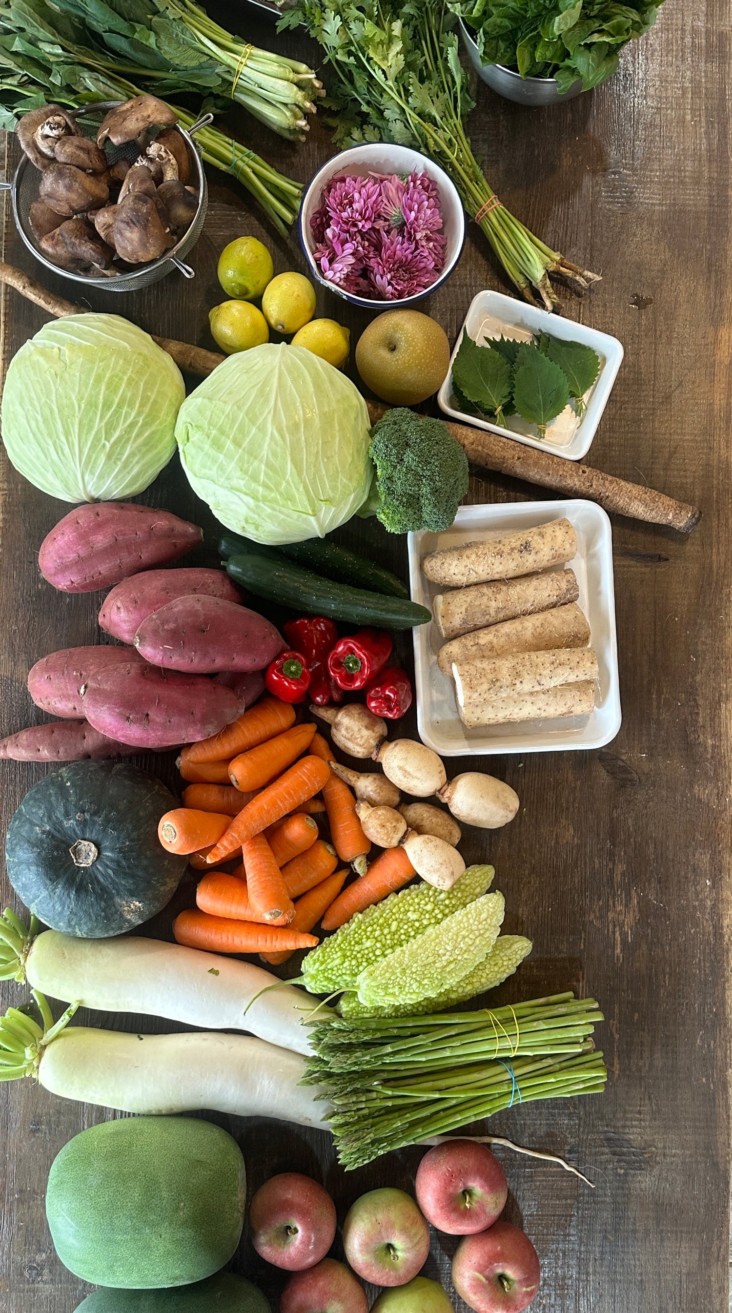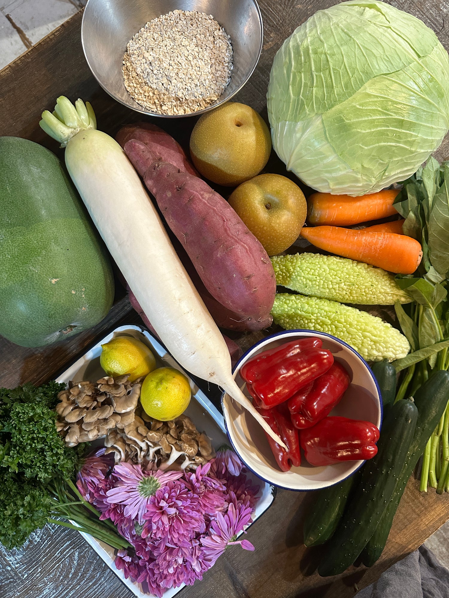冬瓜、さつまいも、キャベツ、人蔘、大根、小松菜、空芯菜、ゴーヤ、きゅうり、赤ピーマン、梨、舞茸、菊の花、オートミール、青レモン