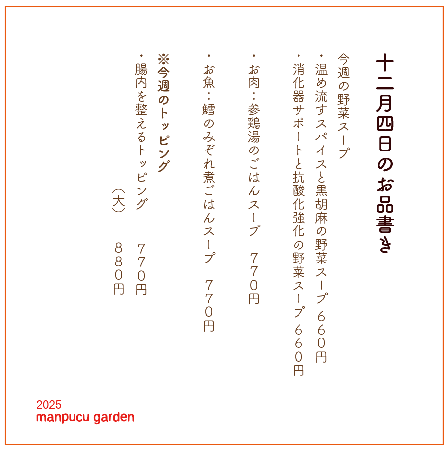 12/4の野菜スパイス/温め流すスパイスと黒胡麻の野菜スープ