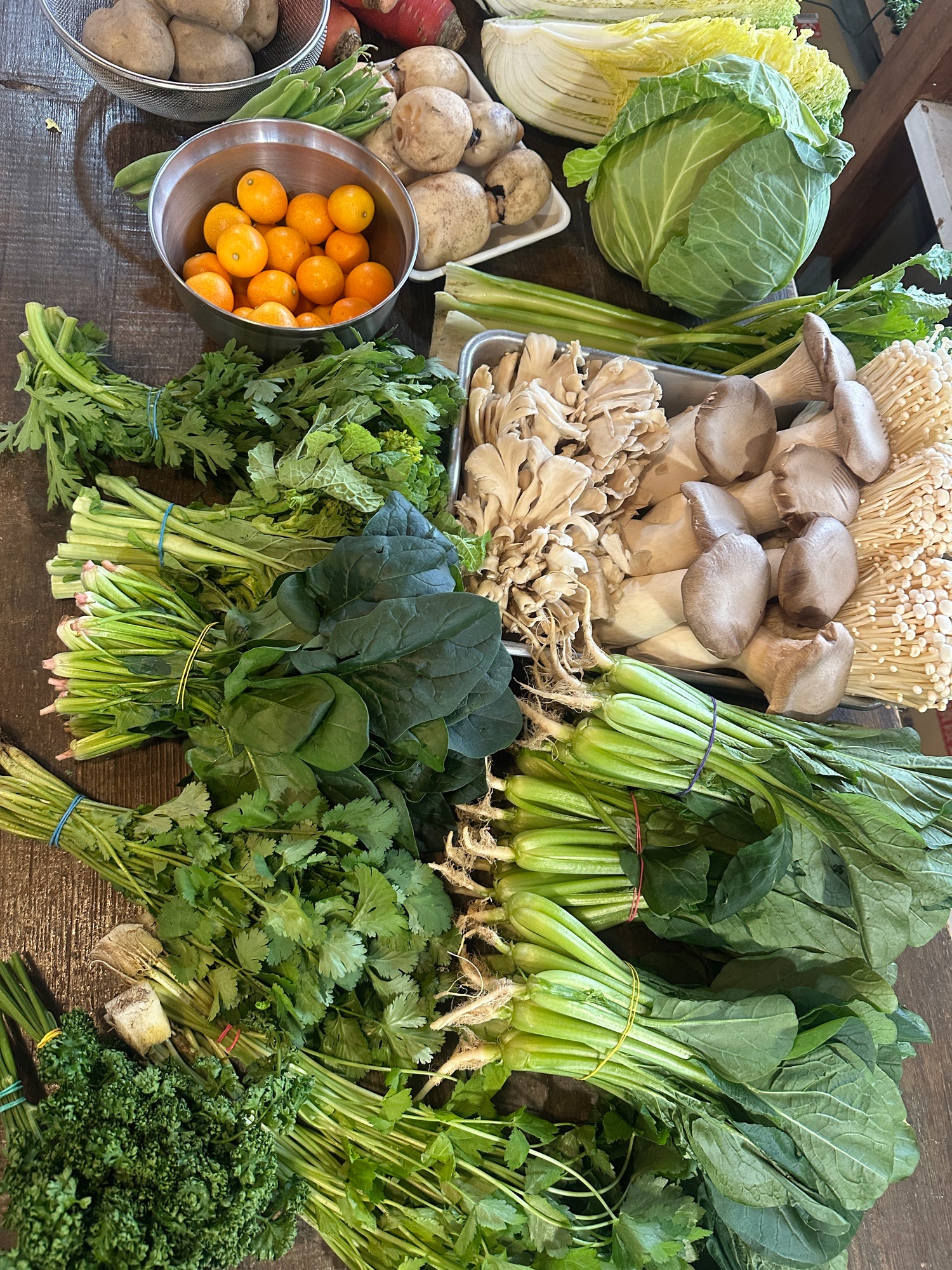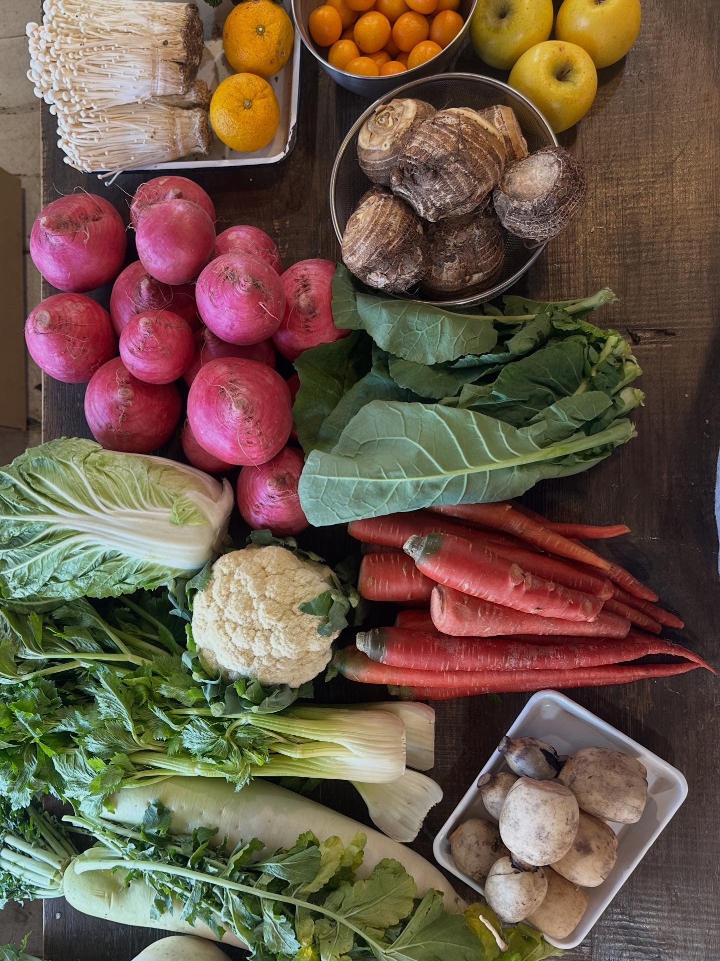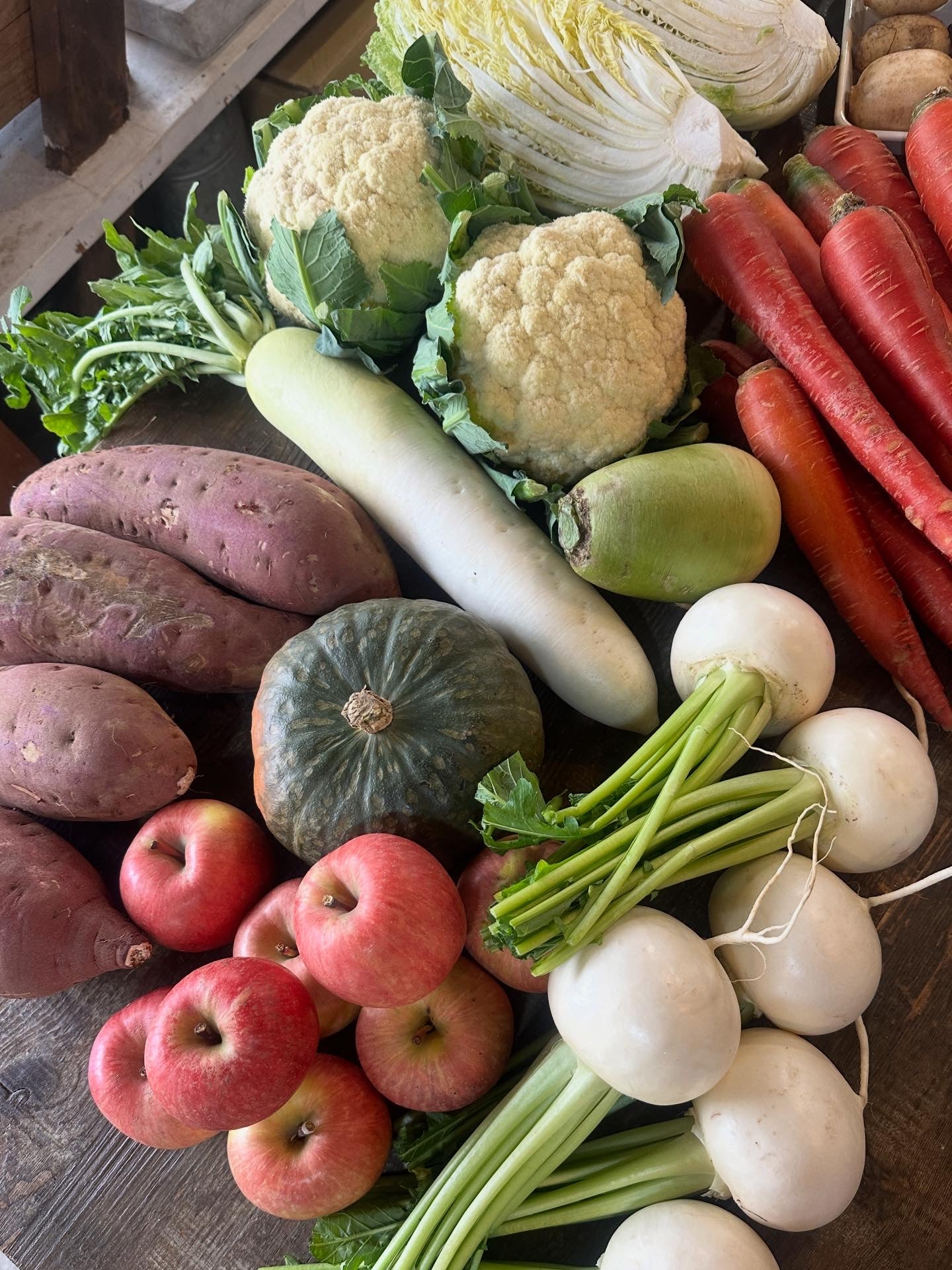 かぼちゃ、かぶ、白菜、カリフラワー、人参、ジャガイモ、小松菜、なの花、ごぼう、えのき、舞茸、金柑、りんご、三つ葉(生)