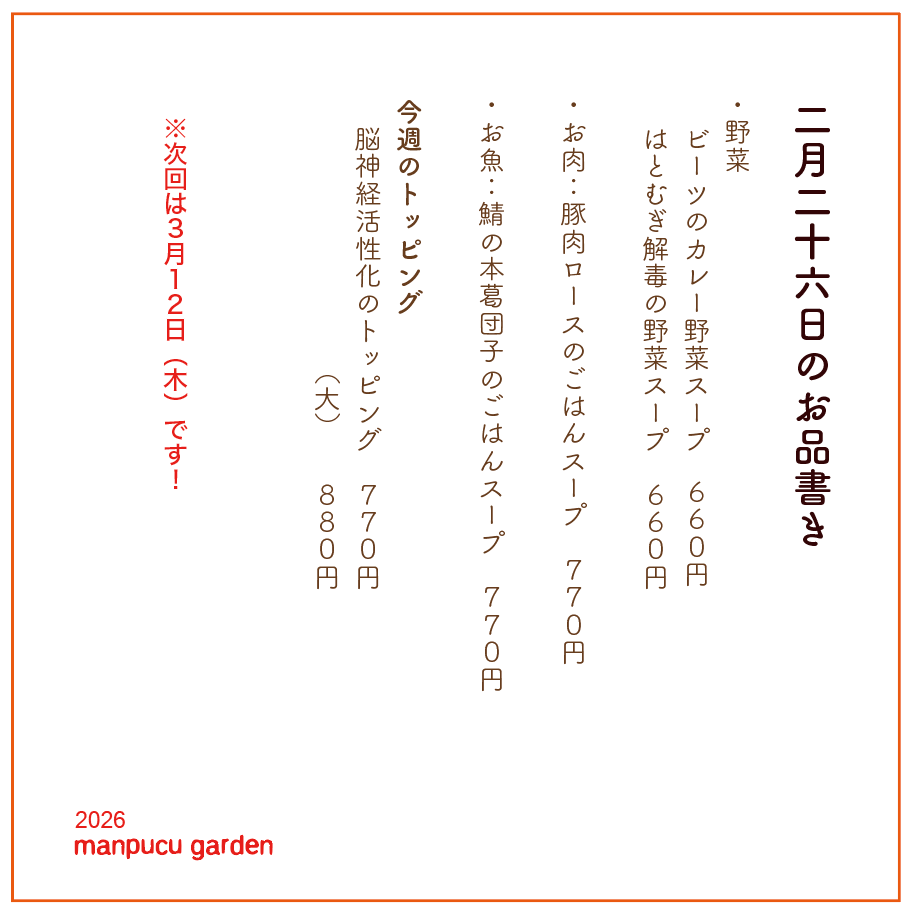 食材も毎週木曜日に仕入れますので、毎週食材は異なります。