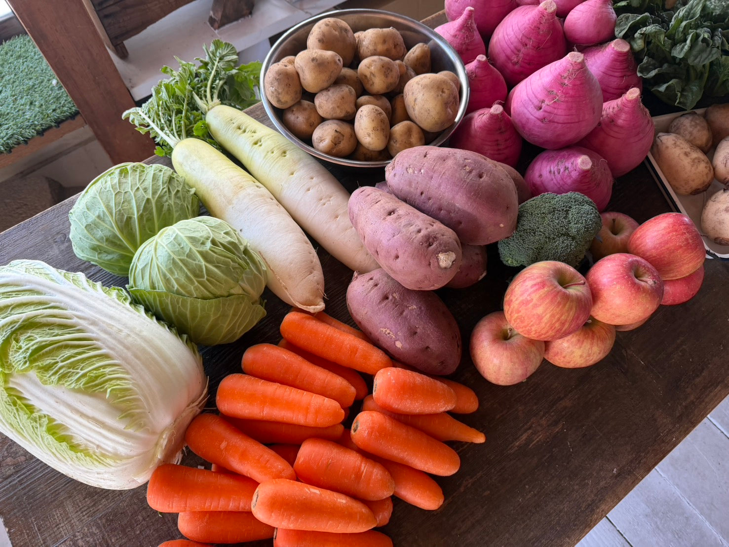 さつまいも、白菜、菜の花、大根、ほうれん草、にんじん、小松菜、黒キクラゲ、りんご、三つ葉(生)