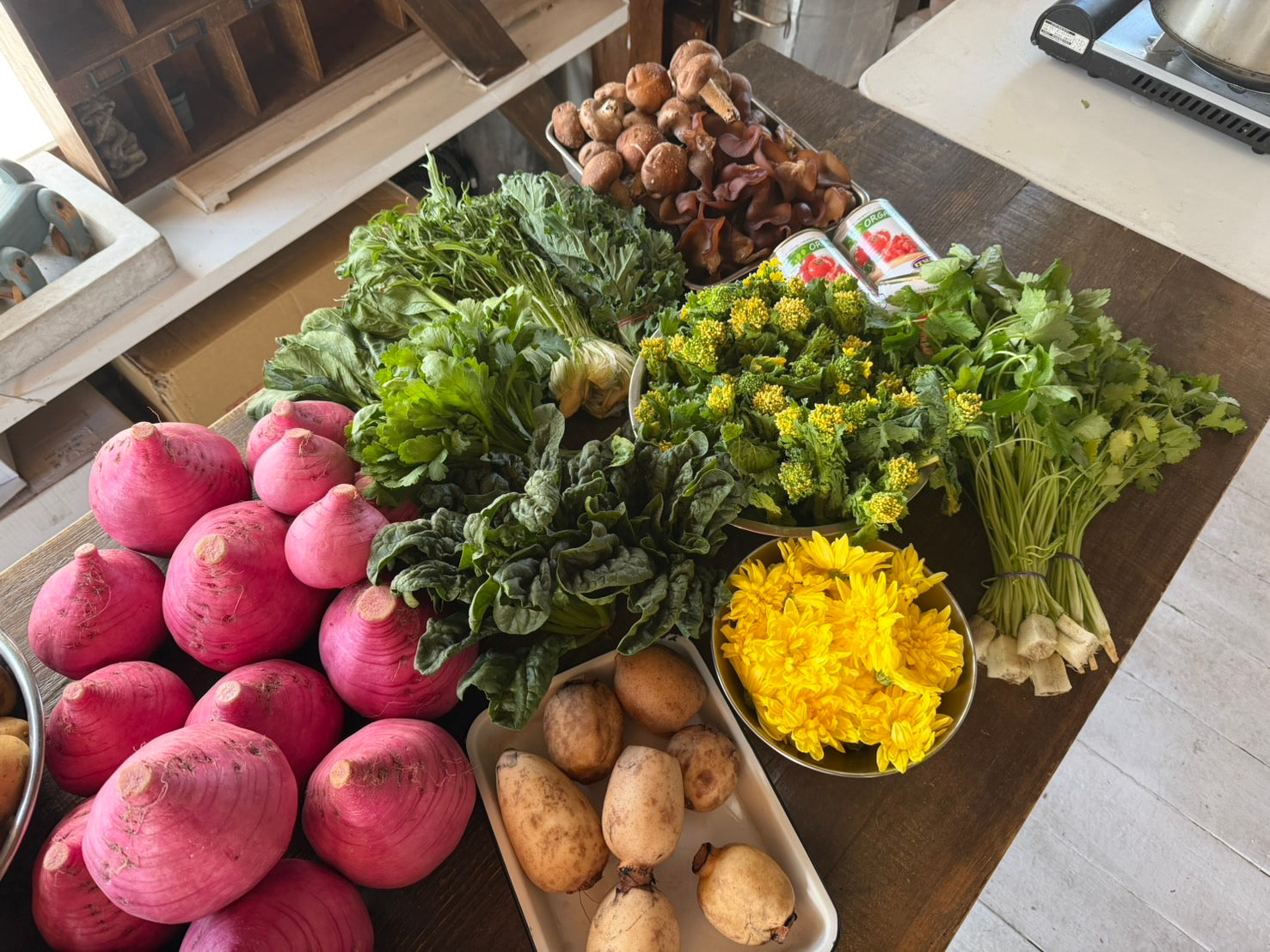 白菜、さつまいも、赤かぶ、人参、いんげん、菜の花、セロリ、小松菜、ブロッコリー、菊花、りんご、ひらたけ、バジル(生)